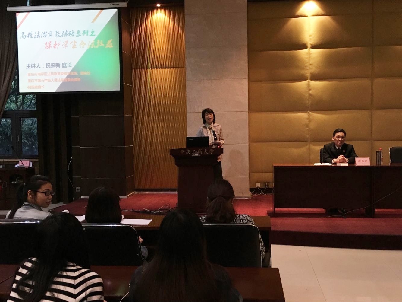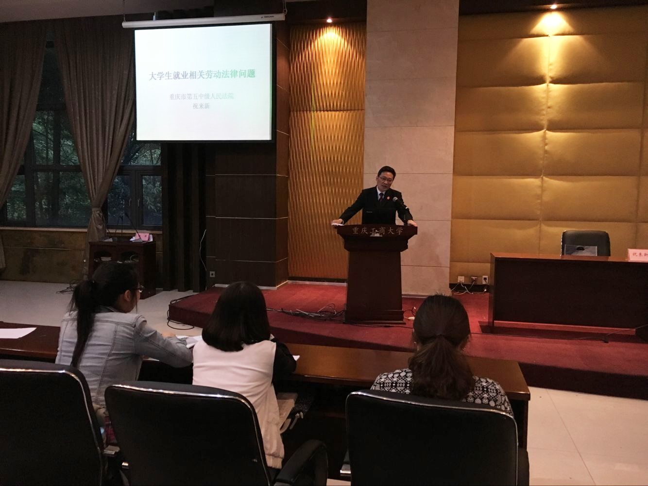 2016年4月26日晚,高校法治宣教活动系列之保护学生合法权益法律讲座在田家炳书院408报告厅成功召开。重庆市南岸区法院原党委组织成员、副院长,重庆市第五中级人民法院省委会成员、民四庭庭长祝来新;原重庆市南岸去法院副院长、原重庆市第五中级人民法院宣教处副处长陈绍惠受邀就大学生就业相关劳动法律问题进行知识宣讲。财政9728太阳集团党总支杨萍书记、分团委徐阔书记、校友联络员杨佳妮及校友代表张明佳出席了本次讲座。