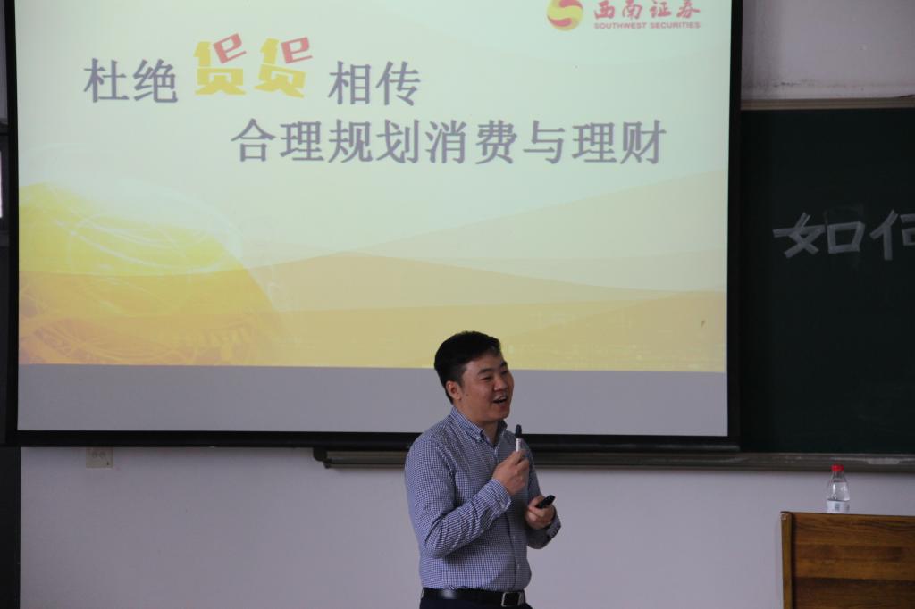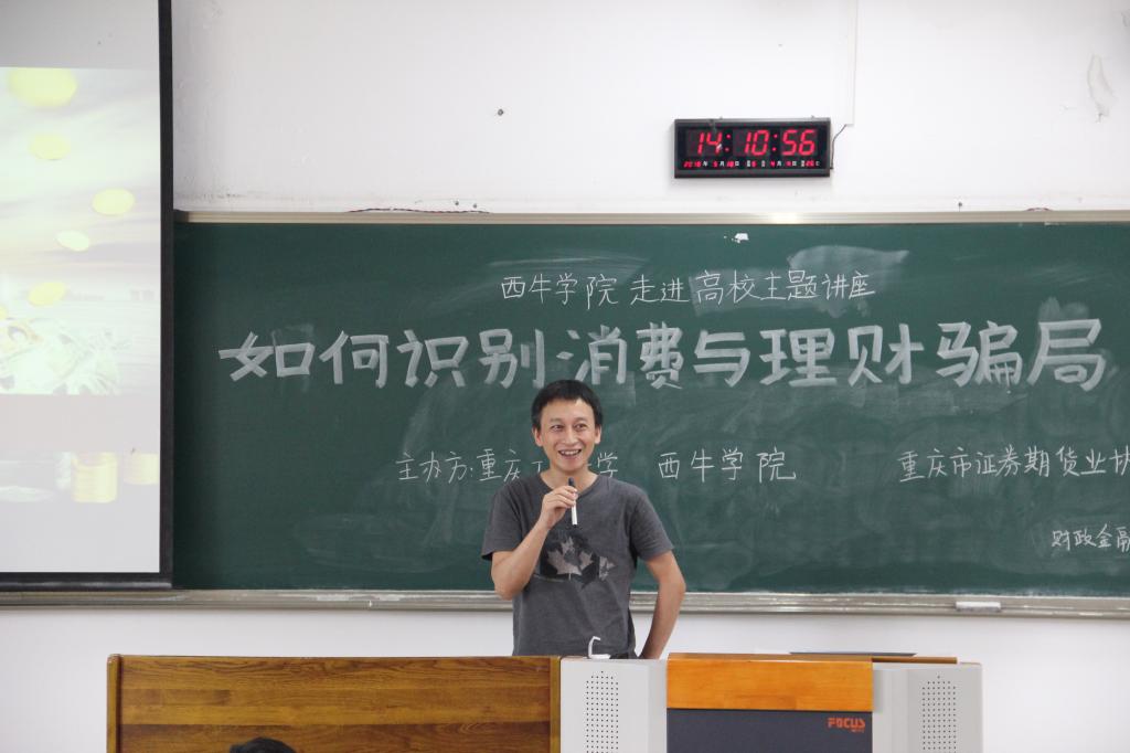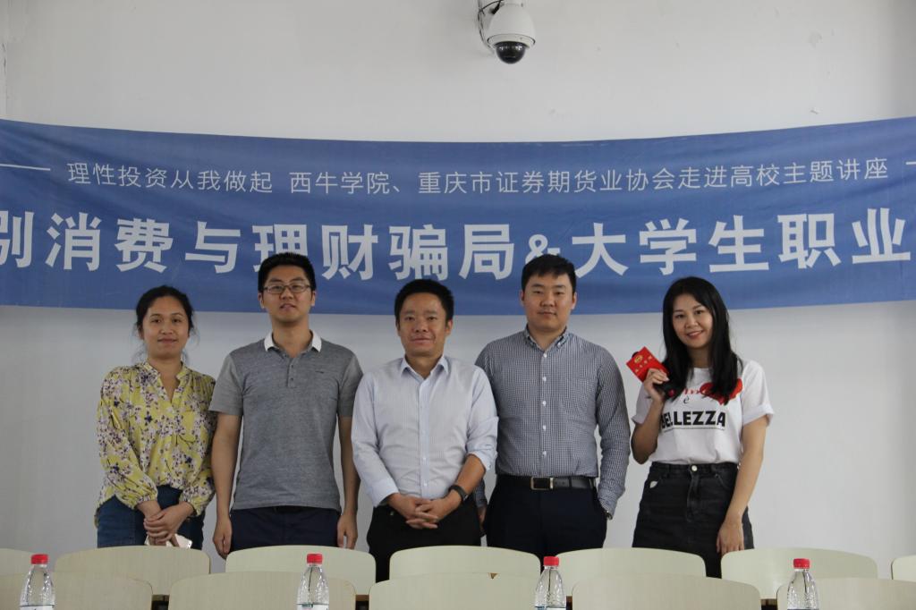 为使大学生了解金融市场风险、提高识别金融骗局的能力,同时为大学生提供就业规划、职业发展的指导与建议,5月18日下午2点,西南证券国家级互联网投教基地“西牛学院”、重庆市证券期货业协会和太阳集团官网tyc9728财政9728太阳集团在博智楼207联合举办了“如何识别消费与理财骗局暨大学生职业发展交流”的主题讲座。西南证券财富管理中心副总经理张涛、西南证券财富管理中心产品经理黄立龙、重庆市证券期货业协会培训部主任朱佳、财政9728太阳集团分党委副书记黄谦以及学团办主任兰丽娟作为嘉宾莅临了本次讲座。