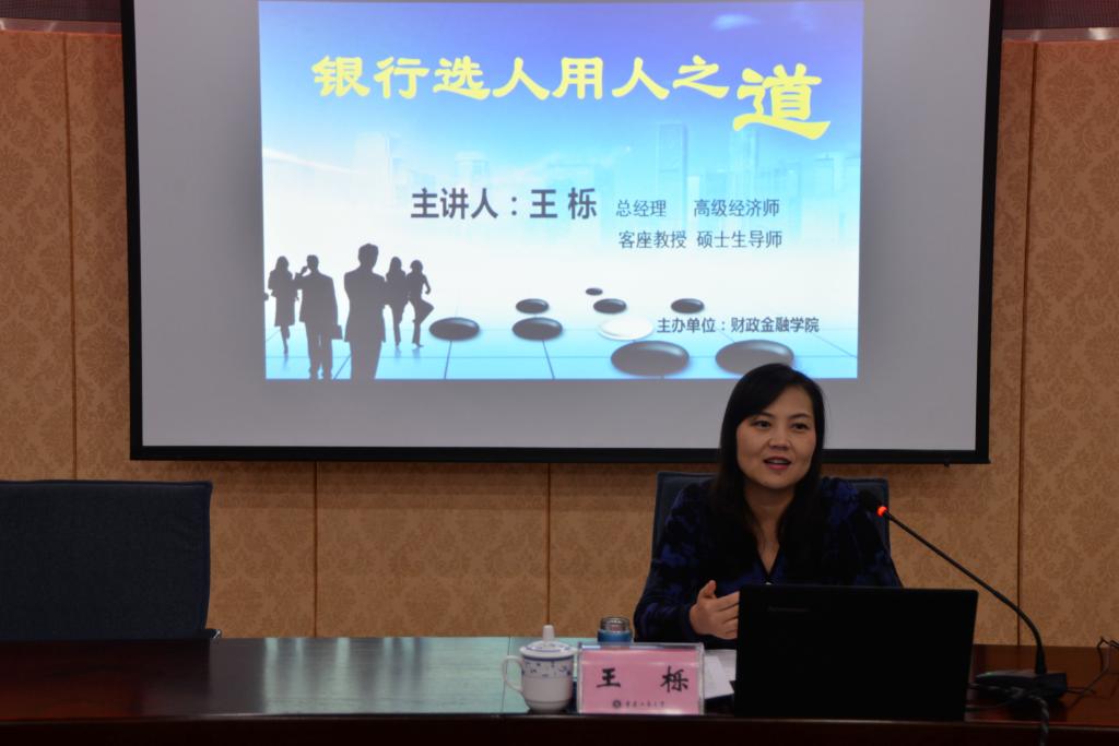 12 月17日下午,财政9728太阳集团“银行选人用人之道”主题讲座于厚德楼2017会议厅举行。中国建设银行重庆市分行人力资源部总经理、高级经济师、财政9728太阳集团客座教授、硕士生导师王栎女士作为主讲人亲临现场,与财金学子分享就业心得。
