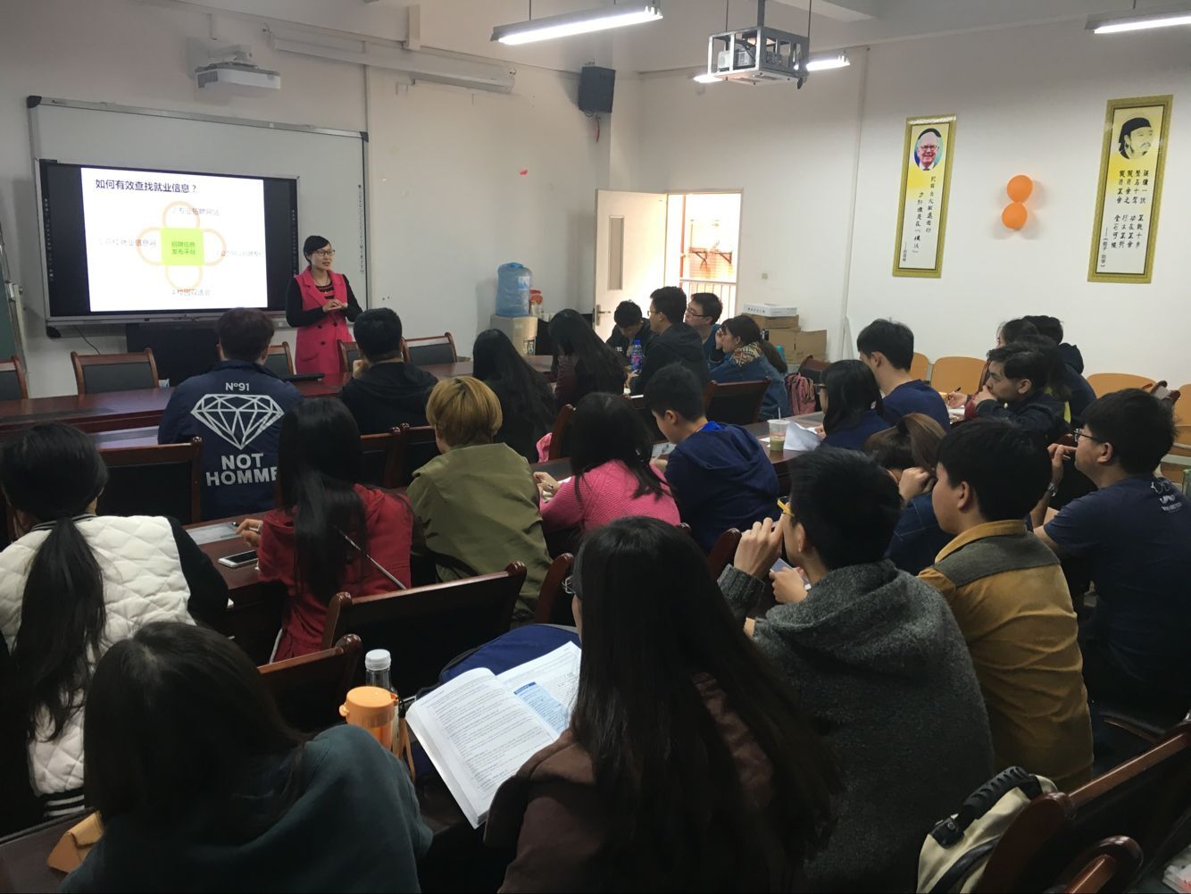 培训伊始,兰丽娟老师从为学生发展的角度,娓娓讲述了就业的相关知识。首先老师就高校就业信息网、应届生求职网、大街网、中华英才网、汇博人才网等就业网站做了简单分析,并详细介绍了相关网站的具体情况,加深了同学们对求职网站的认识。不仅如此,为了使同学们早日与社会接轨,兰丽娟老师还向大家介绍推荐了适合财金学院学子实习的单位,如兴业银行等。条条大路通罗马,兰丽娟老师也为想考公务员的同学们讲述了一些有关考试的一些具体事项,并推荐了“华图”、“中公”两家培训机构供同学们选择。在同学们的深思中。她又向大家介绍了选调生考试,党员公务员以及事业单位考试的相关情况。为了让同学们更好的适应工作情况,兰丽娟老师着重强调了在同学们收到招聘信息之后,不能太过急躁,应当对企业进行一番深入了解,将职位与自身的实际情况相匹配之后,再做决定。