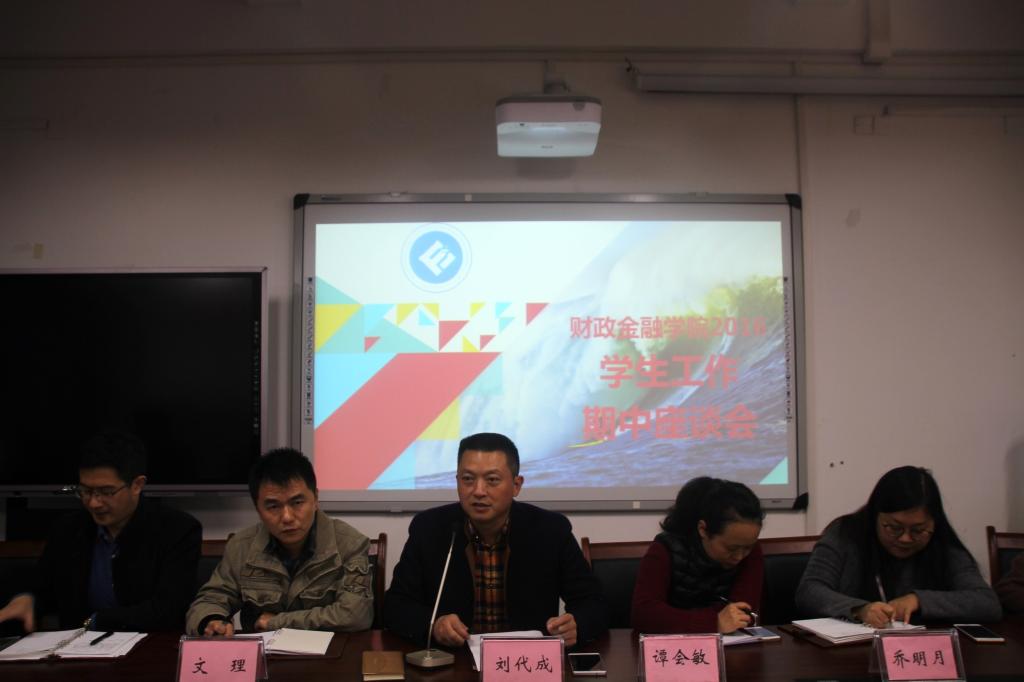 2016年11月22日中午,财政9728太阳集团于田家炳313会议室召开了2016年学生工作期中座谈会,财金学院总党支副书记刘代成、学团办老师、各班代表参加座谈会。