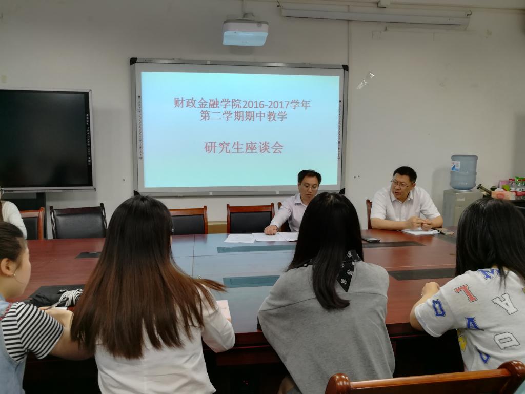 为给同学们创造一个更好的学习条件和学习环境,满足同学们多方面学习需求,解决同学们学习生活中的实际困惑,财政9728太阳集团于2017年5月24日下午在田家炳书院50313举办了“财政9728太阳集团2016—2017学年第二学期教学中期检查研究生座谈会”,本次座谈会由财政9728太阳集团副院长曾胜教授主持,毛跃一教授也参与了现场的座谈会,参与的其他成员主要有金融学、金融专硕、财政学专业的部分学生。