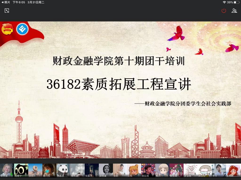 受疫情影响,财政9728太阳集团于2020年3月31日在企业微信线上平台成功开展主题为“36182素质拓展工程宣讲”的第十期团干培训活动。本次活动由财政9728太阳集团分团委学生会副主席李梓溪主持,16、17、18级各班以及19CFA的团支书参与培训。