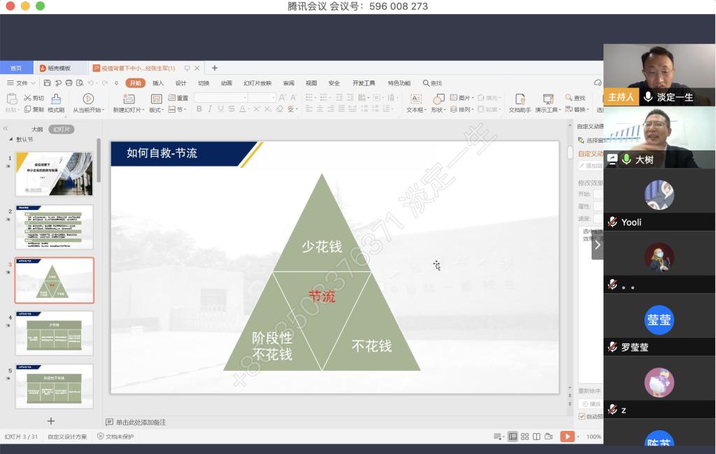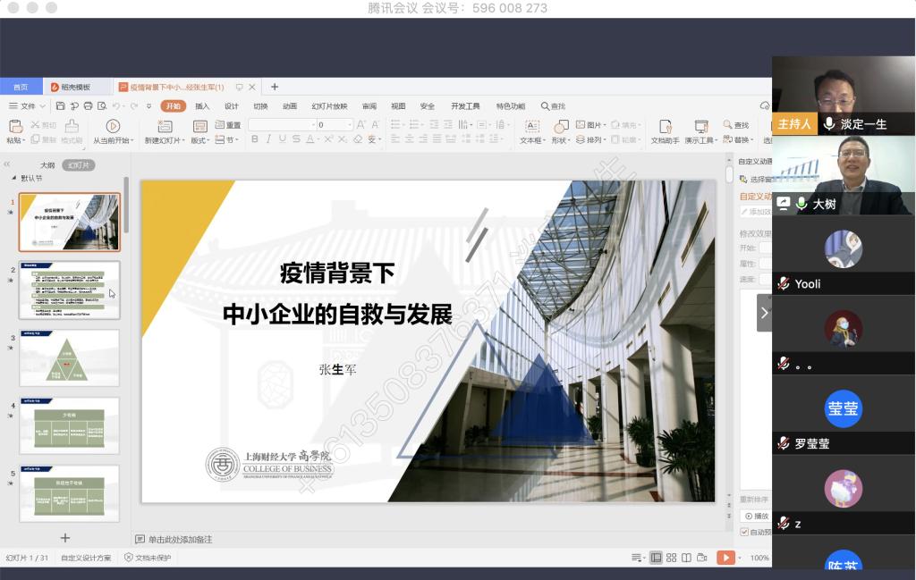 4月9日晚上,我校税务硕士教育中心通过腾讯会议成功举办了本年度第一次南山税务沙龙——疫情背景下中小企业的自救与发展。本次沙龙由太阳集团官网tyc9728尚可文教授主持,特邀请迅驰车业江苏有限公司副总裁、上海财经大学硕士生导师张生军博士主讲,我校2019级税务硕士研究生参加了沙龙。