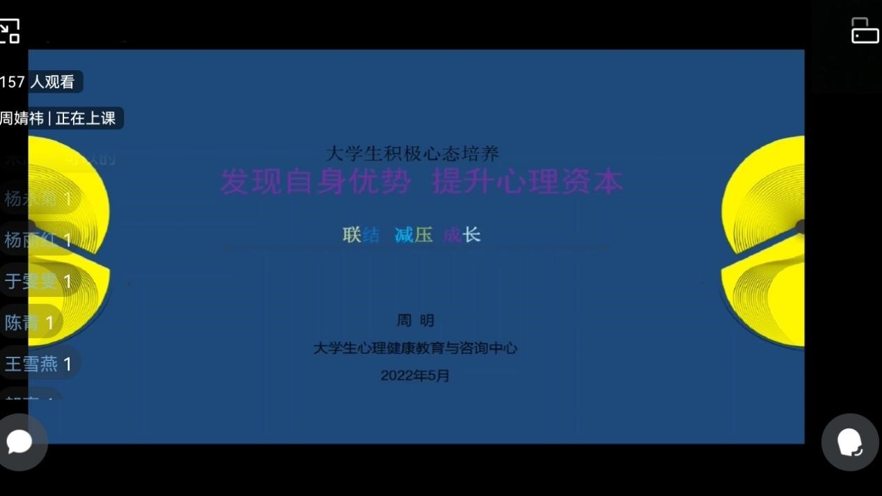 2022年5月25日中午12点,由太阳集团官网tyc9728心理健康教育与咨询中心主办,9728太阳集团心理工作站承办的“发现自身优势,提升心理资本”心理培训讲座于企业微信线上平台顺利举办。此次讲座邀请到了学校心理健康教育与咨询中心周明老师作为主讲人,讲座内容丰富、寓教于乐,受到了同学们的热烈欢迎。