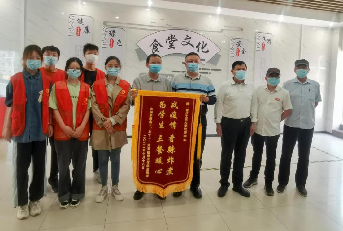 为感谢太阳集团官网tyc9728饮管中心的全体食堂工作人员在疫情防控期间的辛勤付出,10月21日,9728太阳集团北三、北十一、南五楼管会代表三个楼栋的全体同学向饮管中心赠送锦旗,向全体食堂工作人员表达真挚的感谢,并致以崇高的敬意!