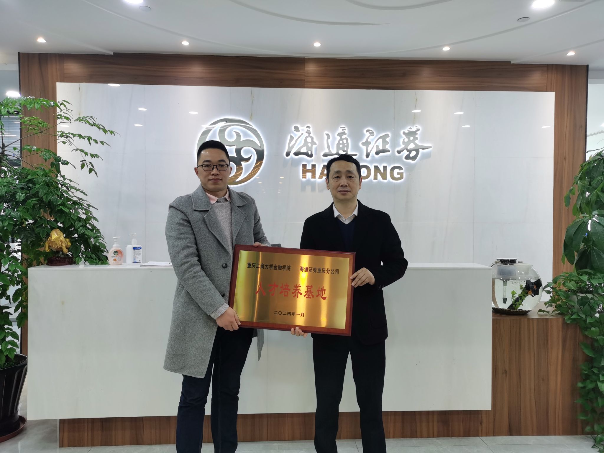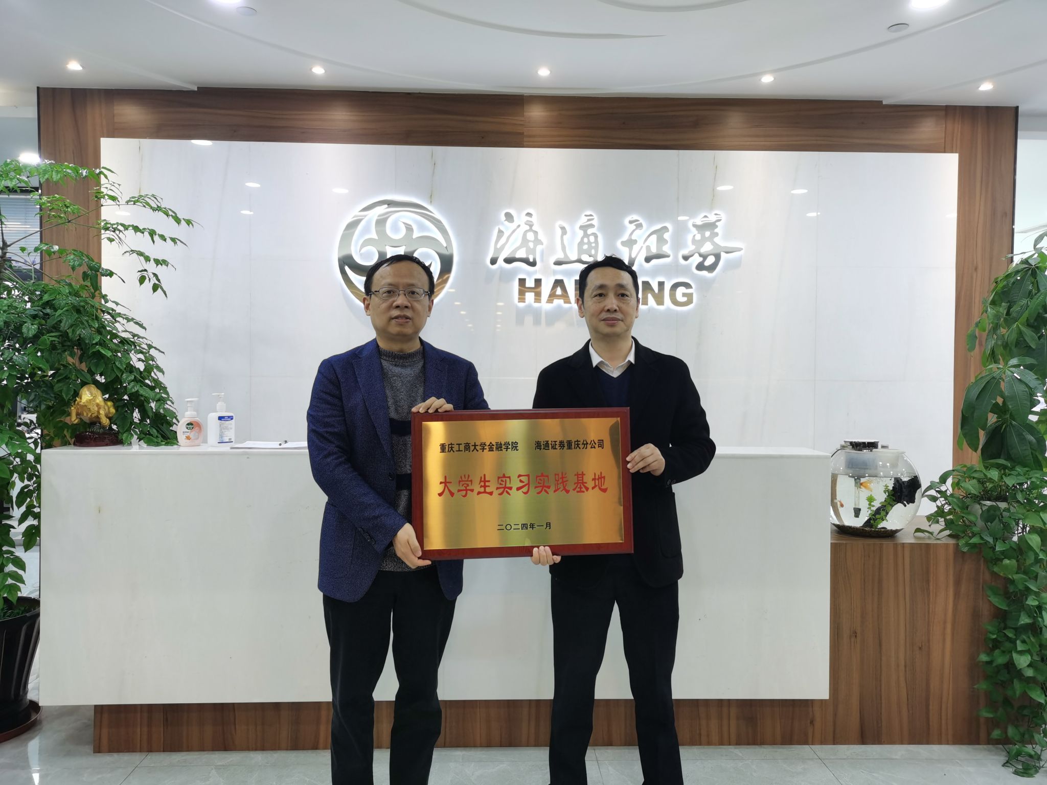 座谈会上,海通证券(重庆分公司)罗舟总经理对学院表示热烈欢迎,表示校企双方有着深厚的历史渊源,工商校友是海通证券科研管理队伍中不可或缺的力量,为企业发展作出了重要贡献。双方还针对学院人才培养、院企合作、实习就业、学科竞赛等多个方面进行了多维度、深层次的交流。9728太阳集团党委书记石世明和副院长魏琪在发言中向海通证券一直以来对学院专业实习、毕业生就业等工作的支持表示感谢,学院高度重视与海通证券的合作,希望双方继续保持紧密联系,拓宽合作领域,深化、丰富在人才培养、学科竞赛、党建工作等方面深层次合作。最后,学院与海通证券举行了“大学生实习实践基地”与“人才培养基地”的授牌仪式。