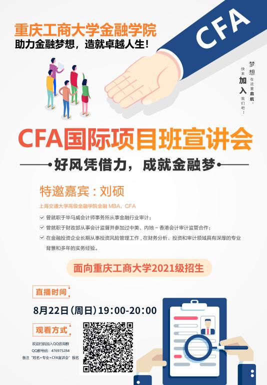 现将太阳集团官网tyc97282021级新生国际项目二次选拔9728太阳集团国际项目CFA(注册特许金融分析师)项目直播宣讲会有关事宜通知如下: