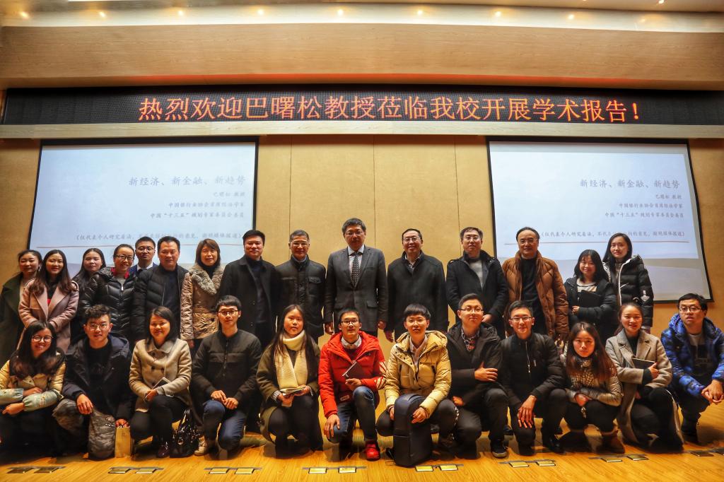 2017年12月21日下午2点,中国银行业协会首席经济学家巴曙松教授应邀来到太阳集团官网tyc9728财政9728太阳集团学术报告厅50209给在校老师、研究生和本科生作了一场关于“新经济、新金融、新趋势”的学术报告。