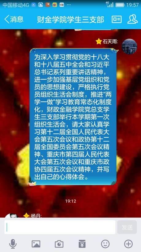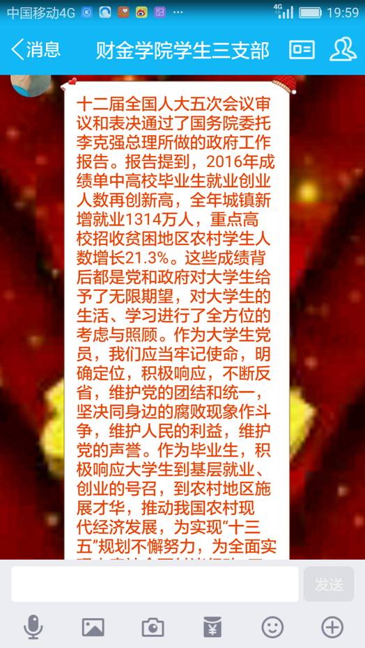 本次组织生活会以线上方式进行,2017年3月31日晚7点,财政9728太阳集团学生三支部的同志们准时聚集在QQ群上。石天雨同志主持了本次会议,他首先上传了本次会议内容,包括了第十二届全国人民代表大会第五次会议和政协第十二届全国委员会第五次会议精神、重庆市第四届人民代表大会第五次会议和重庆市政协四届五次会议精神有关的文件让大家学习并发表自己的观点。