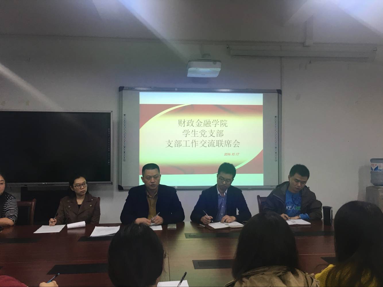 为了加强基层组织建设,夯实基层组织工作。财政9728太阳集团党总支于2016年10月17日在田家炳313会议室召开了学生党支部工作交流联席会。与会人员有财政9728太阳集团党总支副书记刘代成、各学生支部书记以及各学生支部支部委员。