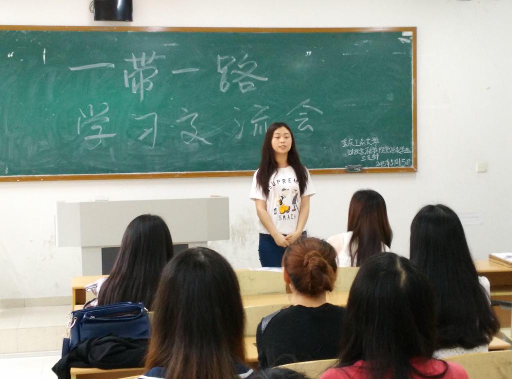 随后,由支部党员就各自对“一带一路”的学习了解进行深入的交流与讨论。12级投资二班的冉雪同学首先表达了她对“一带一路”战略思想的提出和实施的积极支持态度。12级保险班的梁涵同学结合自身的认知,指出“一带一路”的实施有利于解决我国产能过剩的严重问题。11级武荻鑫同学认为“‘一带一路’是我们国家深化对外开放,构建全方位开放新格局,深度融入世界经济体系的重大举措,发展潜力巨大。”