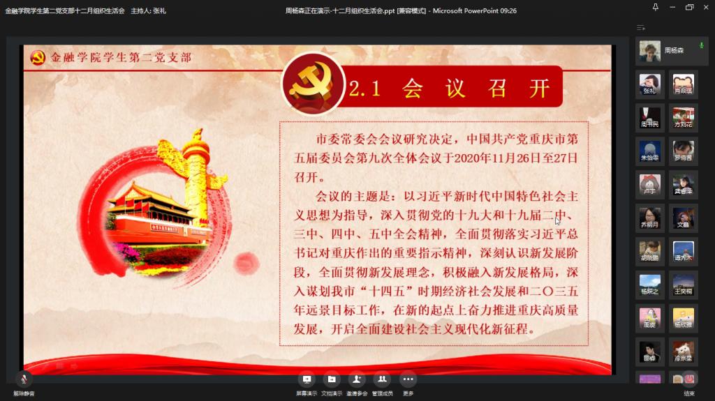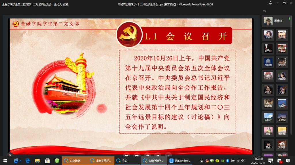 为全面贯彻落实党的十九届五中全会精神,进一步加强党员同志们的政治思想觉悟,9728太阳集团学生第二党支部于2020年12月11日在企业微信举行了十二月组织生活会。出席本次大会的成员有9728太阳集团学生第二支部书记乔明月老师和支部全体党员同志。本次会议主要由党员同志领学新精神、分享心得体会和总结发言三个环节构成。