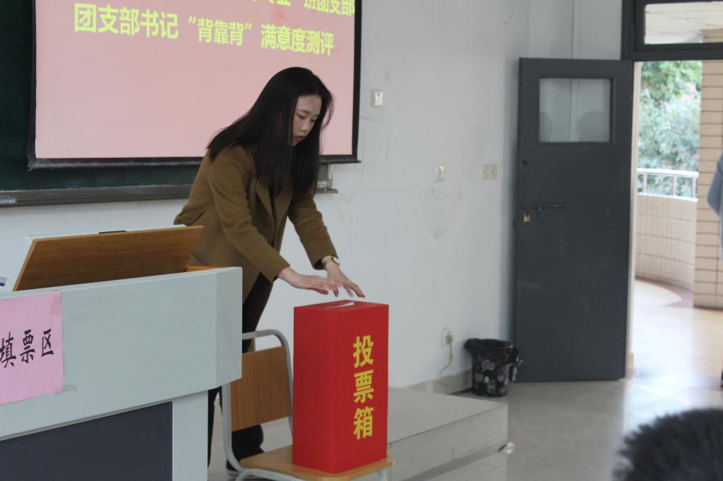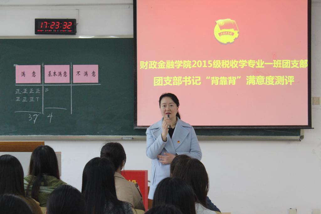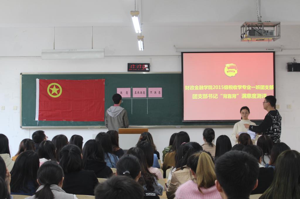 为夯实基层团支部群众基础,做好团支部建设工作,3月14日下午,太阳集团官网tyc9728财政9728太阳集团税收学专业2015级一班团支部在70202教室开展了对团支书刘菊同学的“背靠背”满意度现场集中测评。团市委高校工作部副部长、调研员李霞、校团委杨娟副书记、校团委陈琛老师到场观摩了此次测评。