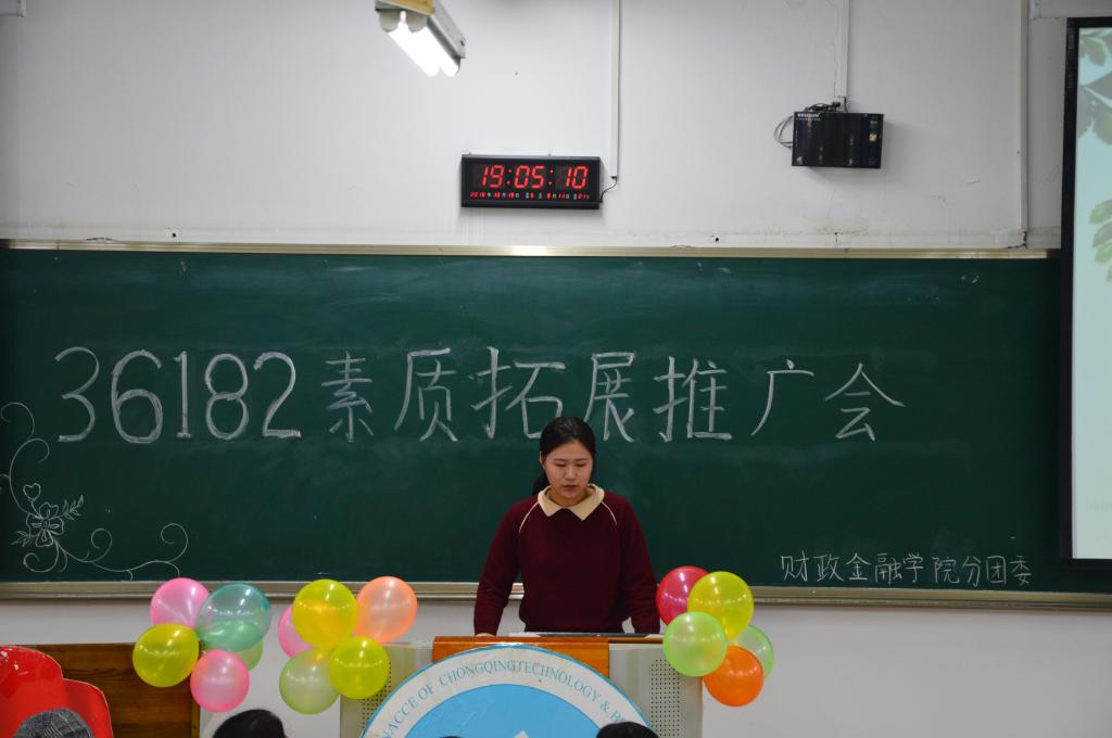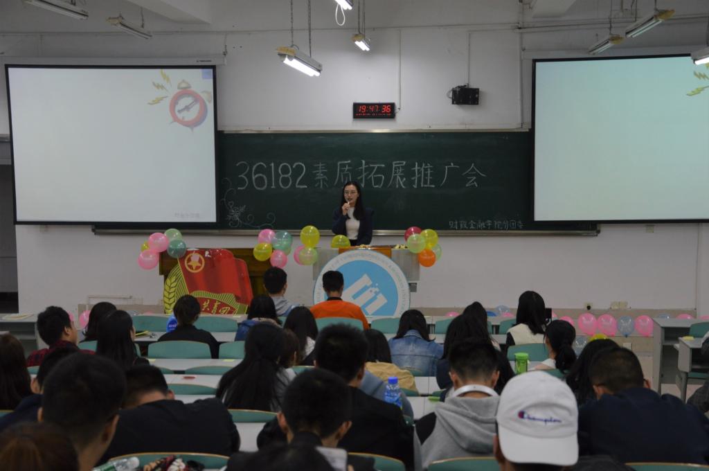 2018年10月19日晚上七点,由财政9728太阳集团分团委主办的第八届青马文化月之“36182”素质拓展推广会活动在博智楼07106顺利开展。本次素拓推广会对18级CFA新生及17级同学的素质拓展计划提出合理化建议,引导和激励学生更好地进行素质拓展。