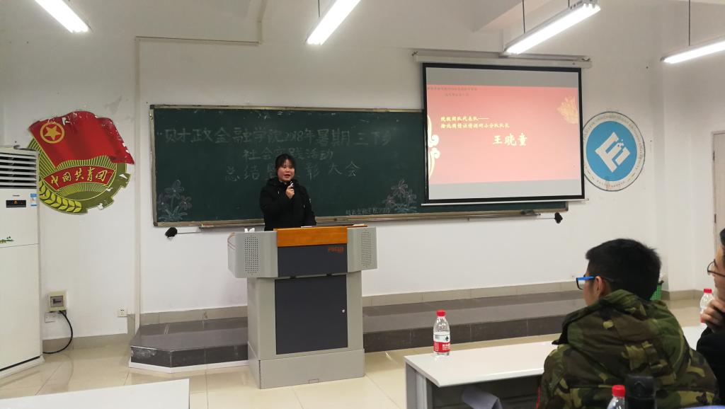首先,徐阔老师上台对社会实践活动进行总结发言,对各实践分队给予了充分肯定和高度赞扬的同时,还提出两点希望:他希望社会实践要继续以宣传贯彻习近平新时代中国特色社会主义思想为主线,推动党的十九大精神进农村、进社区、进企业;他希望坚持社会实践主题要扩展到社会的方方面面,调动学生学习技能和本领的积极性,奠定坚实的工作基础,为实现伟大复兴的中国梦贡献青春力量。随后,财政9728太阳集团分团委学生会主席林哲苏同学上台分别从四个方面汇报了2018年学院社会实践总体情况,他还向大家展示了此次实践活动的荣誉并总结活动中的不足。 紧接着,来自九龙坡“暑期嘉年华”支教小分队负责人高明同学以及院级代表队——渝北国情社情调研小分队队长王晓童同学对暑期社会实践进行了分享交流,他们在老师的指导下,走进九龙坡区金凤镇支教、进入基层探访调研、深入乡村寻求问题,使学生们感受到了改革开放40年来祖国繁荣昌盛,更加坚定理想信念,争做新时代先锋。最后,财政9728太阳集团分团委书记徐阔老师、财政9728太阳集团分团委(学生)副书记书记陈露同学分别为受表彰学生代表颁发荣誉证书,激励同学们弘扬社会实践精神,传承财金良好风尚。