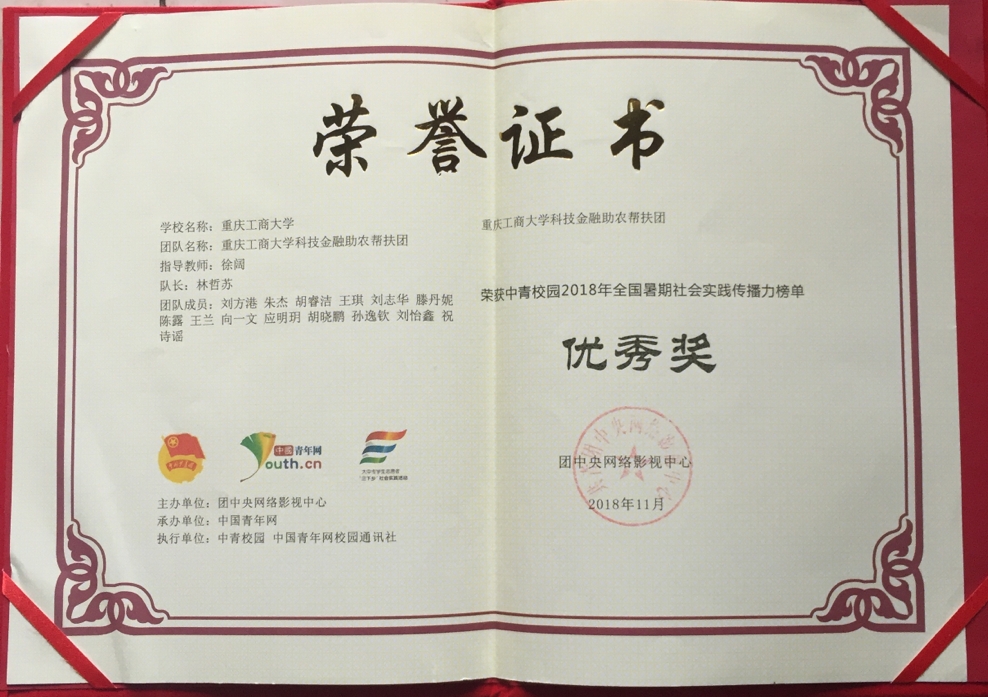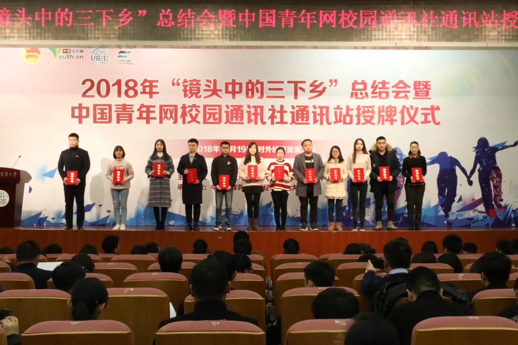 2018年12月19日,由团中央青年发展部、团中央网络影视中心主办,中国青年网、对外经济贸易大学团委承办的2018年“镜头中的三下乡”总结会暨中国青年网校园通讯社通讯站授牌仪式在对外经济贸易大学举行。我院三下乡团队队长林哲苏赶赴北京参与本次会议。本次会议有300余所高校参加,其中包括清华大学、中央财经大学、华中师范大学、武汉科技大学等其他高校。在本次由团中央举办的2018年“镜头中的三下乡”活动评选中,我院荣获全国百强传播力团队表彰。