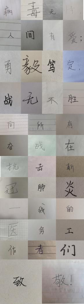感受了接力手写祝福的感动,2017 级投资一班团支部则通过同学们每人手写一个字展现另一种“拼接大爱”,表达了众志成城、团结一心战胜新冠的决心和对一线医护人员真诚的致敬。团支书通过提倡“云旅游”劝诫同学们在抗击疫情关键时刻忍耐住孤独,不能与人群扎堆,坚持到战疫结束、阳光重洒家园时才能去人多的地方玩耍,勉励同学们若无法为抗疫添砖加瓦,那么宅家则是另一种献力方式。