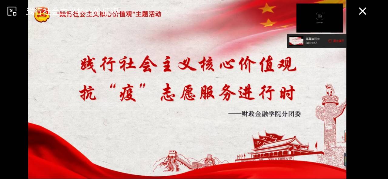 本次活动的主要内容为分享奋战在抗“疫”前线的财金学子故事,身体力行践行社会主义核心价值观。活动伊始,主持人分享了2018级保险一班陶光福的抗“疫”故事。陶光福说:“在冬天天气比较冷,我习惯了等天亮了再起床。但参加防疫工作之后,为了早点接替那些值夜班的民兵叔叔,我每天很早就起来。吃过早饭就赶往卡点进行志愿服务”陶光福每天奔波于家里和卡点之间,对过往人员进行劝导,告知他们政府的相关要求,并对他们进行体温测量与登记。作为财金学子的一员,2018级财政二班朱媛媛、沈玥,在疫情期间加入“中国-意大利抗疫物资信息沟通渠道”团队,为远在地球另一端的意大利人民送去中国学生的温暖与祝福。