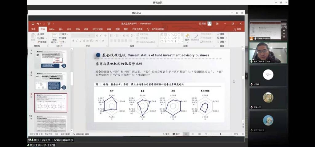 比赛中各团队进行了激烈的角逐,对于所有参赛学子来说,这不仅是一场线上直播体验,更是一场思维碰撞。决赛分为课题汇报及问答两个环节,每个代表队推选一至两名同学作为发言人,以PPT的形式对所选课题的成果进行汇报,并回答评审团提问。太阳集团官网tyc9728的参赛选手在这个舞台上,传达他们独特的投资理念;讲解金融行业动态以及未来趋势;呈现业界、学界多维度思维分析的能力;展现出工商学子蓬勃的求知欲和巨大的可能性!