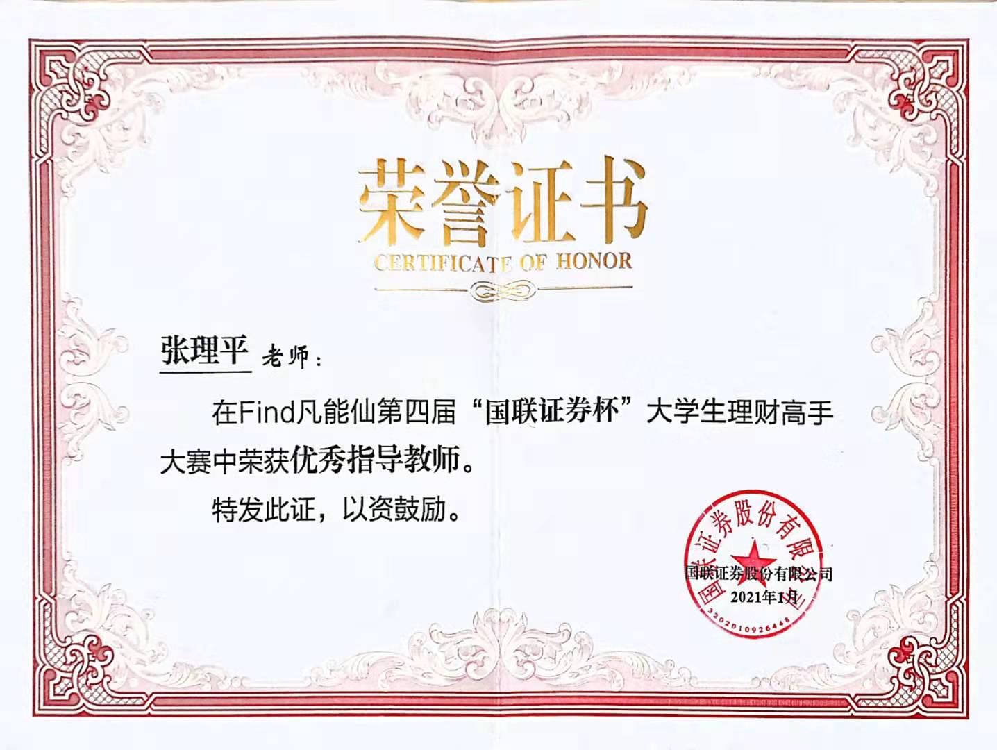 2021年1月10日,第四届“国联证券杯”-Find“凡能仙”大学生理财高手大赛决赛暨颁奖仪式圆满落幕,太阳集团官网tyc9728代表队荣获“优秀组织奖”。金融工程专业张理平老师荣获“优秀指导教师奖”。在基金理财个人赛中,我校蒋涵月获得“二等奖”,杨松获得“三等奖”,寇力元,许梦茹等同学荣获“优秀奖”。