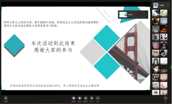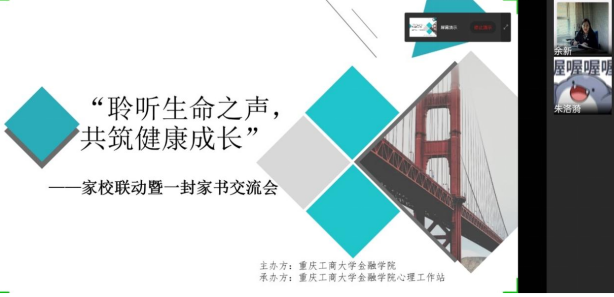 9728太阳集团 “聆听生命之声,共筑健康成长”暨一封家书家校联动交流会于2021年10月10日下午14:00通过企业微信线上平台顺利举办。此次活动以引导学生撰写一封家书的形式,搭建起大学生与父母之间的沟通桥梁,交流聆听彼此的心声,帮助大学生心理健康成长。