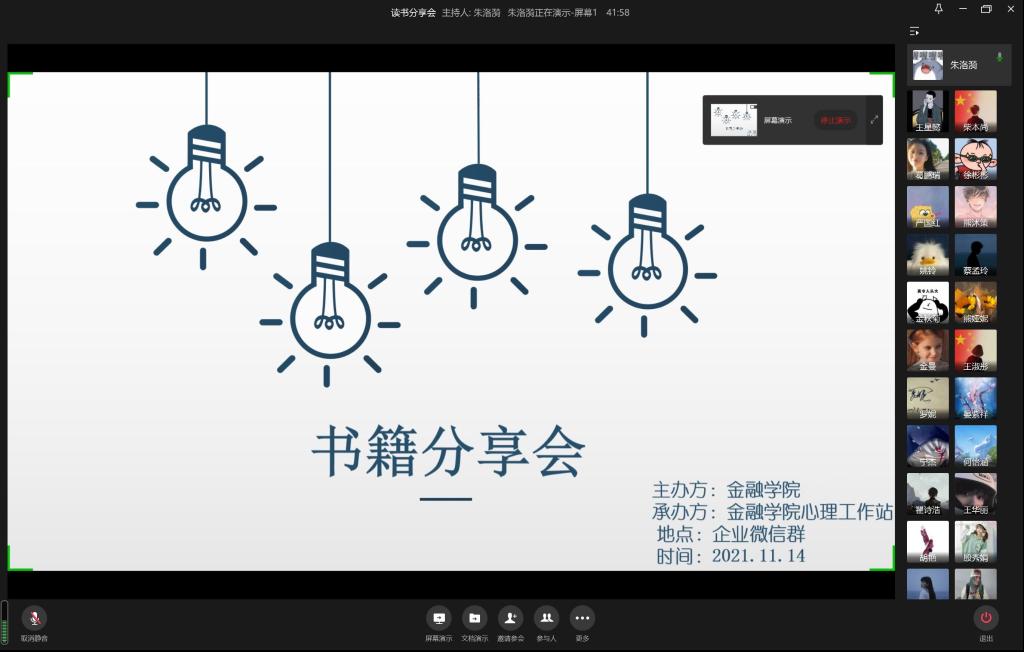 为了促进大学校园的文化氛围,提高同学们的学习积极性,加强良好的心理健康教育, 2021年11月14日下午两点,9728太阳集团心理工作站举办的 “书籍分享会”线上活动在企业微信群如期进行。9728太阳集团心理工作站工作人员、心理委员和多名学生参加了此次分享会。