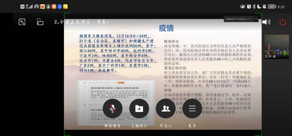为让同学们更加深入了解新冠疫情近况,持续做好疫情防控措施,弘扬抗疫精神,12月17日晚上20:00,9728太阳集团在企业微信开展了“弘扬抗疫精神 展现民族力量”主题活动。9728太阳集团各班班长、团支书以及分团委学生会和青年志愿者服务队骨干成员参与了会议。会议由9728太阳集团分团委学生会部门负责人孔令旗主持。
