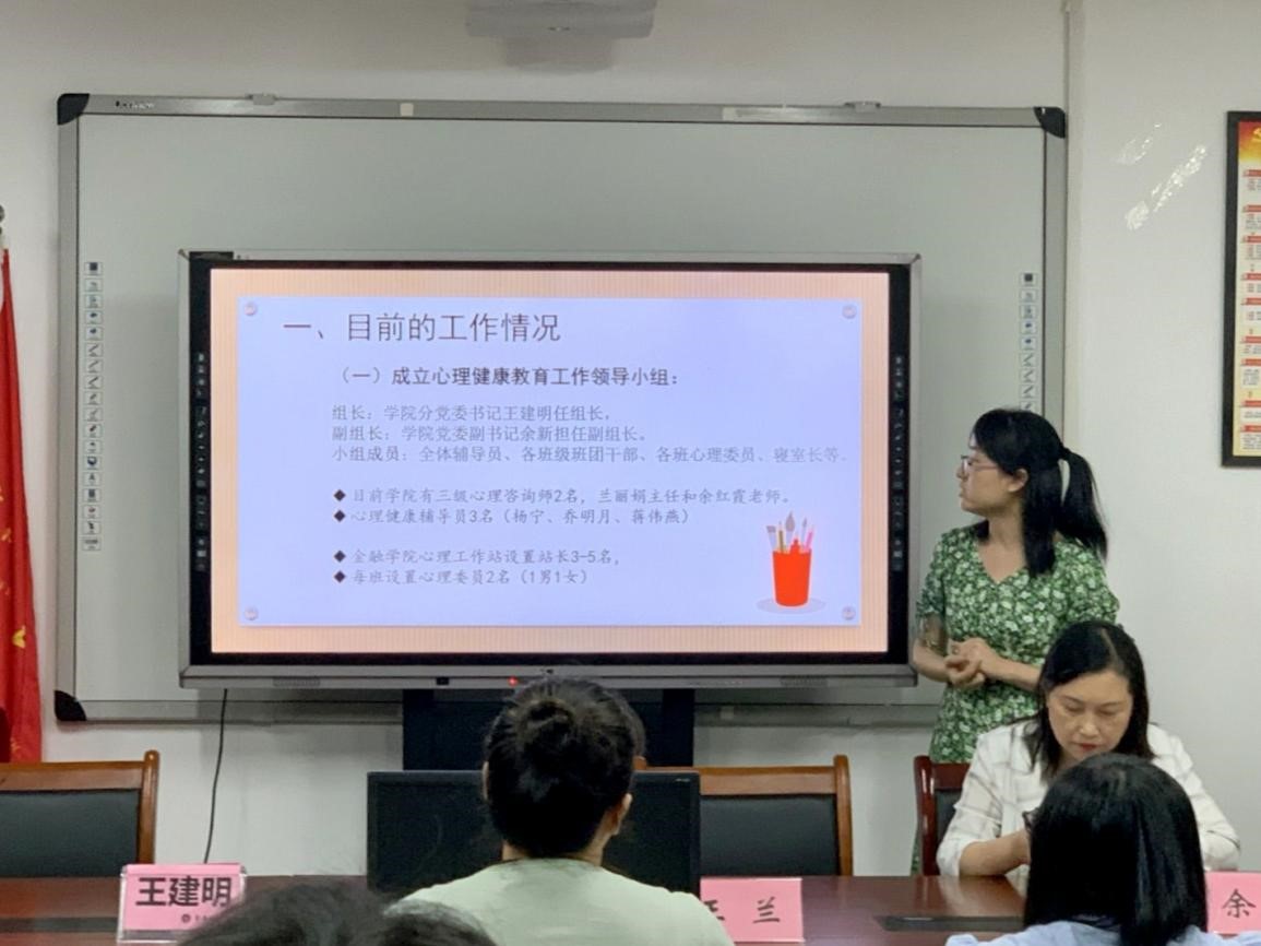 接下来,9728太阳集团心理工作站负责人蒋伟燕老师对9728太阳集团心理育人工作进行了梳理。蒋老师从领导小组、工作途径、活动开展等多方面进行了我院心理健康教育工作进行了总结。