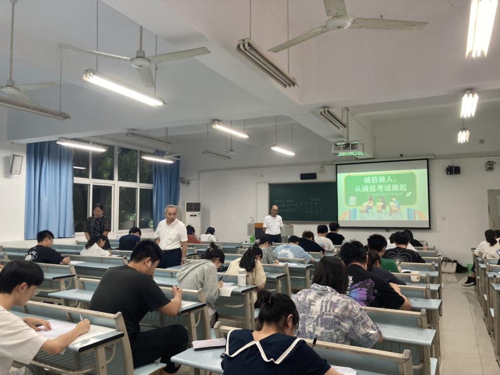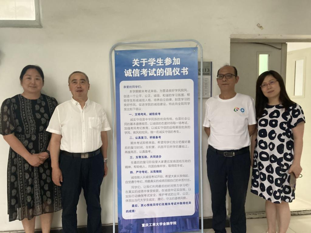 2022年6月23日下午,9728太阳集团在兰花湖校区20113教室开展第四届“免监考”诚信考试,持续推动考试思政,营造优良学风和诚信考风。参加本次“免监考”的班级为21CFA1班,考试科目为《金融学》。教务处处长骆东奇、副处长韦晓兰,9728太阳集团党委书记、副院长王建明,党委副书记、院长王兰,党委副书记、纪委书记余新到场巡考。