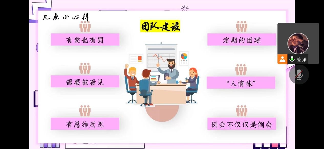 董洋首先从“学生骨干”四个字分别展开讲解,说明学生干部应以“学习”为主,具有“生气”并积极“生长”,拥有高尚的“品格骨气”,作为“干事”要努力行动付出,强化学生干部的模范带头意识,培养学生干部的模范带头能力。他分享了六个小技巧和七个小心得,让学生干部在平时工作中更加得心应手。针对团队建设提出六点要求:团队建设应该有奖也有罚;应有定期的团建;团队中的每一个人都需要被看见;团队内部应有人情味;团队活动应有总结有反思;团队例会不仅仅是例会,更是沟通的机会。