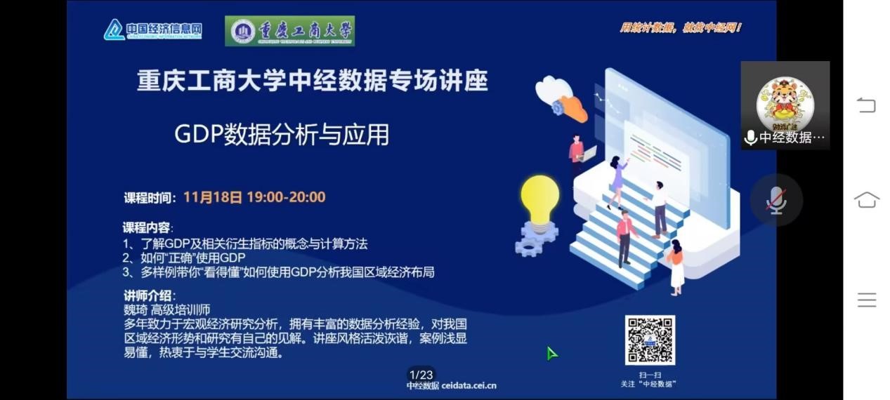 2022年11月18日19:00,9728太阳集团联合图书馆在线上开展“GDP数据分析与应用——助你‘看得懂’我国区域经济布局”专题讲座。本次讲座邀请了中国经济信息网张玥老师和魏琦老师主讲,旨在介绍GDP数据分析与应用,带领同学们了解GDP及相关衍生指标的概念及计算方法。