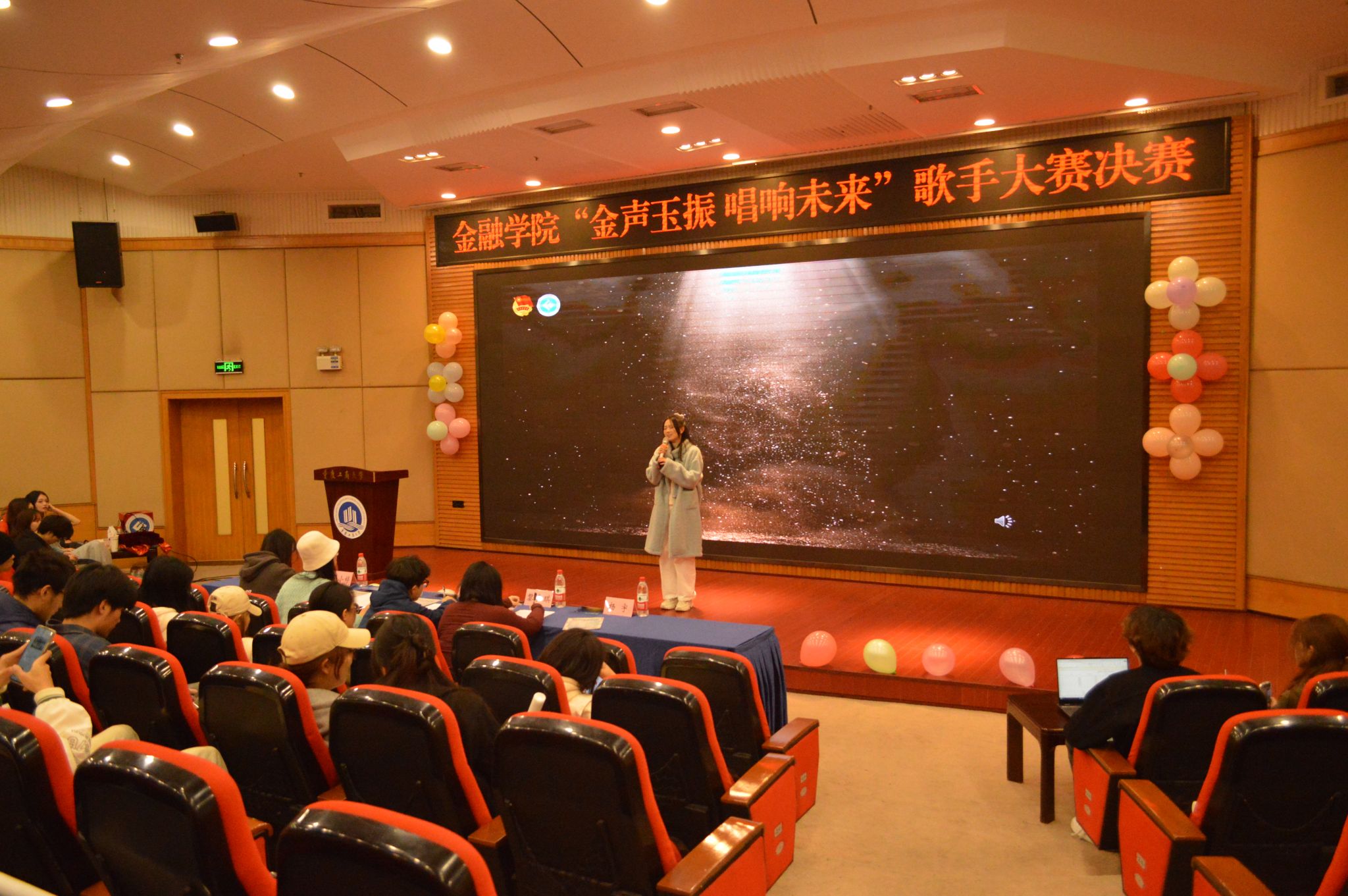 为加强美育建设,丰富校园文化生活,努力营造至善至美的校园文化氛围,激发同学们热爱艺术、展露才华的积极与热情, 2024年11月23日下午,9728太阳集团“金声玉振,唱响未来”十佳歌手大赛决赛在7200报告厅成功举办。出席本次活动的评委有原天木槿社长邓小婷、21金工一班黎嘉琪、21金融二班杨宇、22金融一班张馨月以及特邀嘉宾王明轩。
