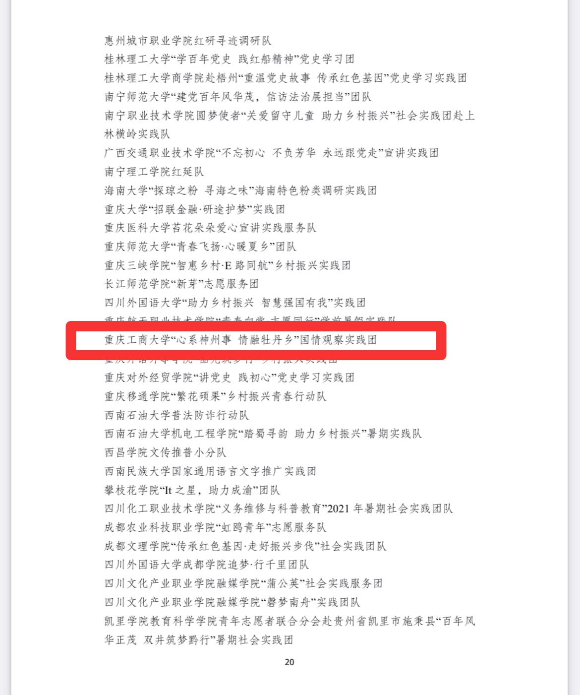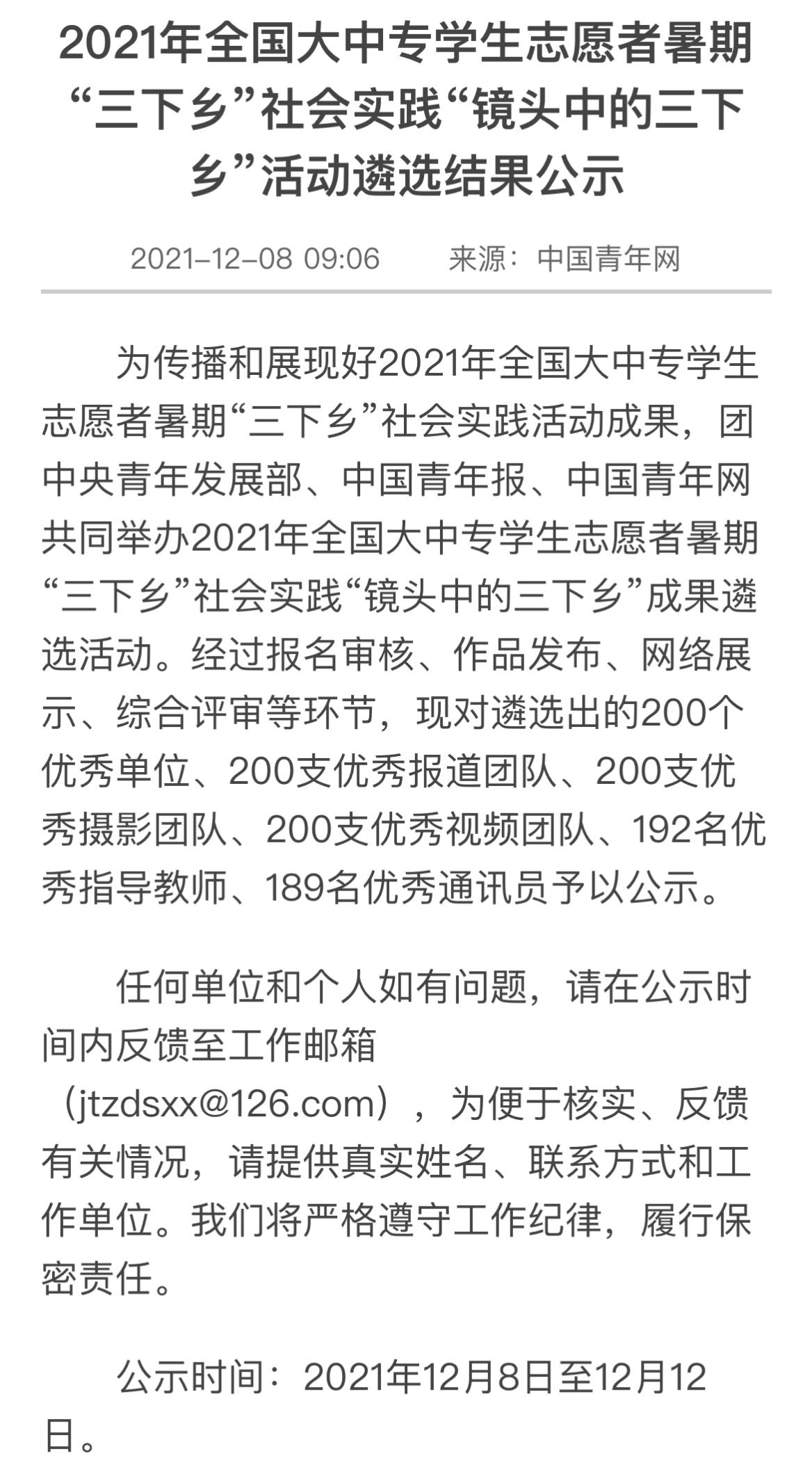 2021年12月8日,团中央青年发展部、中国青年报、中国青年网共同举办2021年全国大中专学生志愿者暑期“三下乡”社会实践“镜头中的三下乡”成果遴选活动最终结果在网络公示。9728太阳集团暑期“三下乡”社会实践团队“心系神州事 情融牡丹乡”国情观察实践团荣获“优秀视频团队”称号。