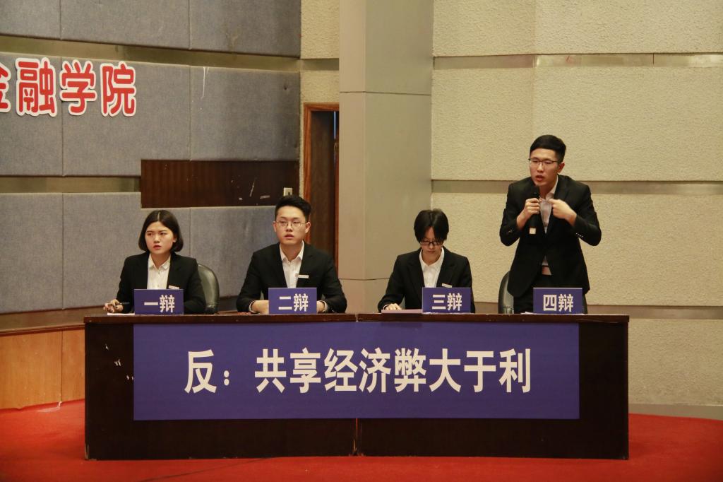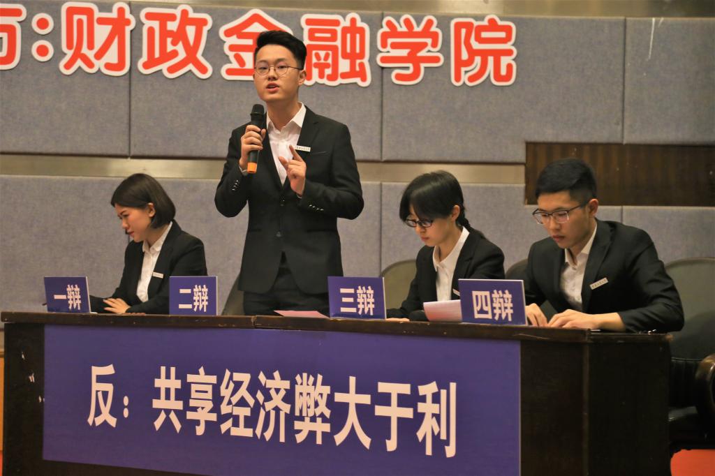 进入决赛的是财政9728太阳集团辩论队与环境与资源学院辩论队。双方就“共享经济利大于弊/弊大于利”展开辩论。比赛伊始,作为正方的环境与资源学院开宗明义,通过分析市场现状和共享经济发展趋势阐明了“共享经济利大于弊”的观点。我方辩手则提出了共享经济会提高社会成本,占用社会资源的观点,并从另外一个角度剖析共享经济的蓬勃发展容易导致恶性竞争从而破坏市场规则,影响经济的正常运行,进而论证了“共享经济弊大于利”的论点。在随后的自由辩论与总结陈词环节,双方辩手你来我往、旁征博引,以沉稳冷静、妙语连珠的表现获得了在场观众与评委的阵阵掌声。