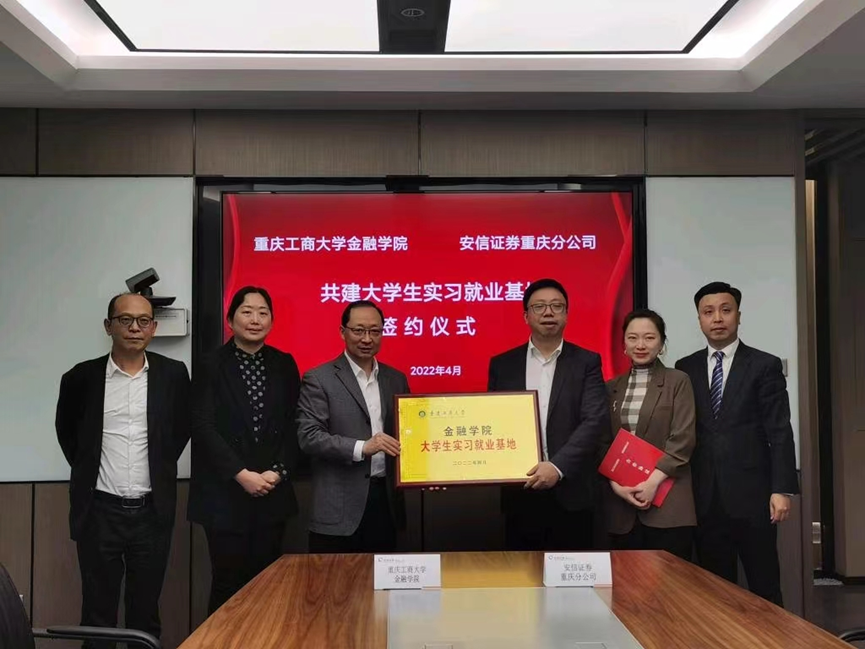 在走访安信证券重庆分公司座谈交流会上,我校2003届优秀毕业生、公司总经理丁洪一向张波介绍了安信证券重庆分公司的基本情况和发展规划,分享了他在校的难忘经历,表达了对母校培养的感激之情,并希望今后加深双方合作。随后,双方就实现产教融合、做学合一,共建“实习就业基地”等项目展开交流。王兰代表9728太阳集团同安信证券重庆分公司签订了实习实训基地协议,张波为双方“共建大学生实习就业基地”授牌。