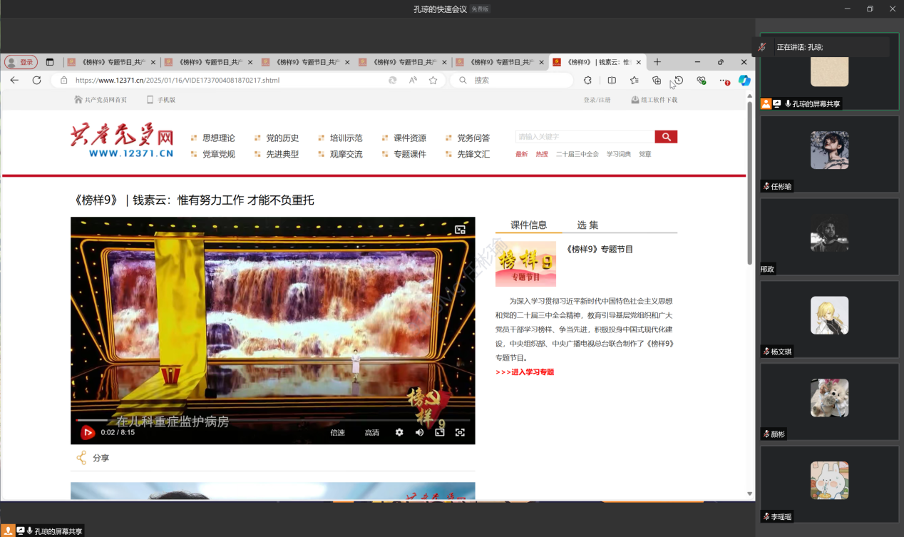 在学习会上,大家通过观看《榜样9》,了解到了陈清洲警察,走烂了27双皮鞋,扎根基层二十余载,穿梭在大街小巷,将辖区的百姓当作自己的亲人,从治安管理到社区服务,从打击犯罪到化解纠纷,他都始终冲锋在前,真正做到了想群众之所想,急群众之所急。这让我们明白,作为一名共产党员,要把对党的信仰融入血液中,做到心中有党,听党话、感党恩、跟党走。青岛新前湾集装箱码头公司党委以理想信念铸魂,夯基固本,为青岛智慧码头实现技术超车注入了强劲的红色动能,展现了强大的党组织凝聚力与战斗力。红其拉甫边防连战士用皲裂的双手擦亮界碑,用睫毛结冰的眼睛守望黎明,在生命禁区筑起移动的钢铁长城。这堂跨越时空的党课让我们触摸到初心的重量。边防战士用生命诠释的"缺氧不缺精神"的信念,恰似一面对照灵魂的明镜。作为新时代的奋斗者,大家都深刻感受到了新时代共产党员坚定信念、无私奉献、改革创新、担当作为的精神风貌,将以这些榜样为标杆,在今后的日子里不断磨砺自己,奋力前行,以实际行动践行共产党员的初心与使命。